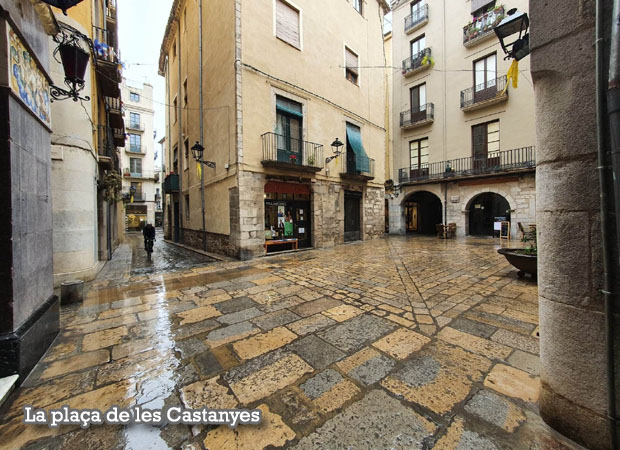 El nom de plaça recorda l'antic mercat d'aquest producte que s'hi celebrava des de molt antic. És un espai quadrangular, amb sis entrades, i envoltada de cases de tres pisos d'alçada amb comerços i establiments de restauració. El paviment, enllosat, mostra un dibuix. Antigament, el carrer dels Mercaders englobava aquesta plaça i arribava fins les Voltes d'en Rosés. S'hi venien castanyes i altres fruites seques, almenys des de la darreria del segle XVIII, si bé en determinats moments, com l'any 1833, l'Ajuntament autoritzava els venedors de queviures que no cabessin a la plaça de les Cols (actual Rambla de la Llibertat) a traslladar-se a aquest indret.