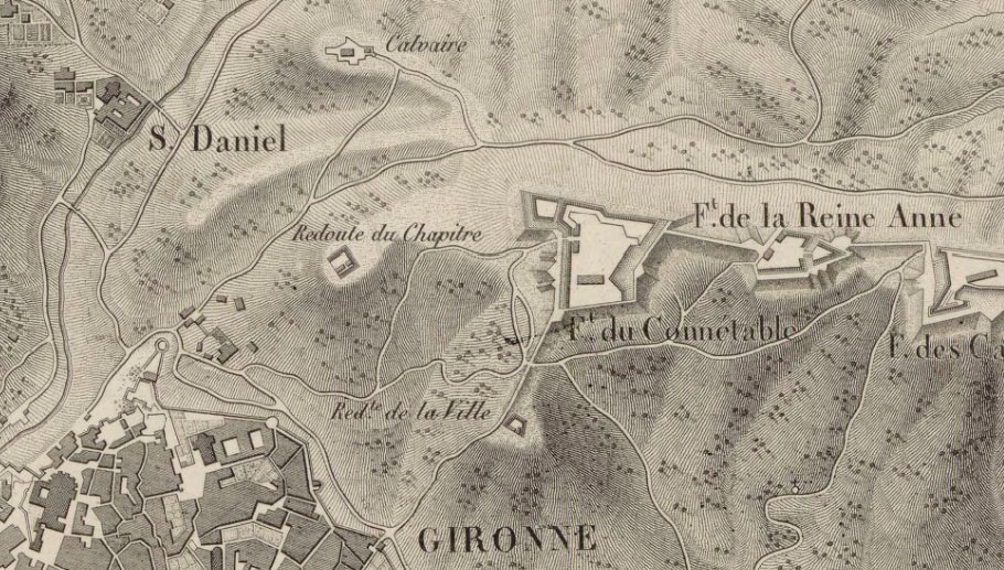 (Ampliar) - Detall de "Plan de Gironne et de ses environs, dessiné par Louis Armand Paulmier". Ca. 1820. Bibliothèque nationale de France.