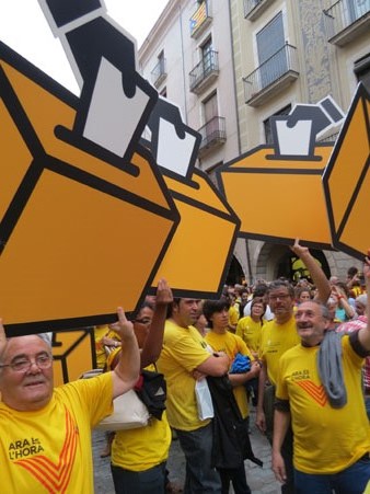 Síntesi: El 30 de setembre 2014 es varen concentrar 4.000 persones a la plaça del Vi per donar suport a la consulta i protestar contra la suspensió per part del Tribunal Constitucional. Crits de "volem votar" i "independència" van acompanyar la concentració, convocada per l'Assemblea Nacional Catalana (ANC) i Òmnium Cultural a la mateixa hora i a tots els municipis del país. L'actriu Txe Arana i el director de Temporada Alta, Salvador Sunyer, van donar el tret de sortida a la campanya penjant de forma simbòlica el primer cartell a favor del Sí-Sí a la façana de l'ajuntament de la ciutat. L'escriptor Josep Maria Fonalleras es va encarregar de llegir el manifest unitari que es va poder escoltar davant els ajuntaments d'arreu de Catalunya.
