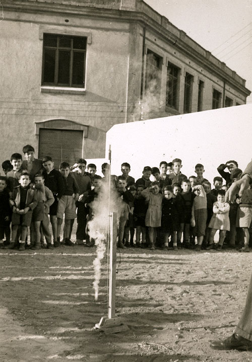 (Ampliar) - Llançament d'un petard al pati d'esbarjo de les Escoles d'Ensenyament Primari de Foment de Cultura. 1955. Autor desconegut. CRDI - Ajuntament de Girona.