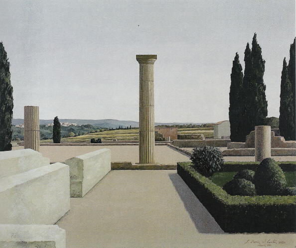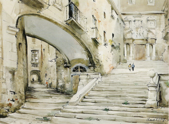 Francesc Miralles. -I-El dia 22 d'abril de 1994 s'inaugurava a Girona una mostra titulada Els Roca-Delpech, on es presentaven obres de Jaume Roca Delpech i del seu fill Santiago Roca D. Costa (1). L'exposició, a part de les connotacions afectives que tenia, presentava un punt d'anàlisi del major interès, en posar una davant de l'altra les obres dels dos pintors "realistes" més consolidats a Girona, a partir de la guerra. Roca Delpech era el representant de la generació de la inmediata posguerra; Roca D. Costa, el representant de la generació de renovació. El Roca pare fou el creador i consolidador de l'anomenada escola gironina d'aquearel·listes; el Roca fill fou el més radical representat Girona de l'anomenat nou realisme. Confrontació de generacions que, de manera puntual, permet apreciar l'aportació de Roca D. Costa. No és aquí el lloc d'analitzar la rica personalitat de Roca Delpech, desdoblada en músic i pintor, que va escriure a Josep M. López Picó la quarteta: "Músic i pintor ensems, Aquí només vull subratllar les característiques essencials de la seva obra, de la seva obra aquerel·lística, deixant de banda la sèrie amplíssima de "dibuixos humoristics, satírics, punxants, divertits, obscens, alegres i dfesvergonyits" que va realitzar per a ell mateix al llarg de la seva vida (3). La seva obra d'aquarel·lista -la pintura a l'oli només va emprar-la una curta temporada en acabar la Guerra Civil i la va reprendre poc abans de morir- es pot analitzar des d'aspectes tècnics, temàtics i socials. En els trenta anys de la seva trajectòria pictòrica evolucionà en la manera de plantejar-se l'aquarel·la: en un primer moment, dibuixava amb nogalina a la ploma, sobre paper humit, si bé en alguns paisatges de muntanya i camps emprava l'aquarel·la pura. En aquesta llarga etapa el color era viu i fort. Més endavant, la nogalina va ser substituïda pel traç a tinta xinesa, aplicada sobre el paper sec. Durant un temps, la línia de dibuix era molt gruixuda, i marcava molt els ritmes de la composició. El color, progressivament i imperceptiblement, es va suavitzar i es va tornar més agrisat en conjunt, d'on destacaven pinzellades de color viu (4). Aquesta manera de fer, de concretar l'aquarel·la, llunyana a la tècnica de Frederic Lloveras i Ceferí Oliver -que freqüentaven Girona acabada la Guerra Civil i que van contribuir a impulsar la passió per l'aquarel·la-, va imposar-se entre el grup de pintors gironins que conreaven aquesta tècnica els anys quaranta. Tan important com aquest aspecte d'impulsor del grup d'aquarel·listes gironins, fou la concreció i popularització que va fer del paisatge gironí. La ciutat de Girona ja havia estat copsada amb certa profunditat per pintors com Josep Aguilera, però fou Roca Delpech qui en va mostrar una i mil facetes, qui va descobrir-ne moltes, qui les va tipificar. La seva aportació ha estat fonamental respecte de la imatge de Girona en la pintura. A la mostra esmentada, la vintena d'aquarel·les de Roca Delpech contrastaven fortament amb la vintena d'olis de Roca D. Costa -com ja s'evidenciava al cartell publicitari (5), que reprodueix la Pujada de Sant Domènec del pare i Ormond Quay-Dublin del fill-. El contrast és evident; les tècniques, llunyanes: el traç nerviós, ràpid i virtuós de la línia sobre el fons de color esvaït de l'aquarel·la contrasta amb les superfícies planes, dibuixades prèviament, amb un color viu i sense matisacions de l'altre. Tot el que és moviment i vida en l'obra del pare és quietud i repòs en l'obra del fill Però aquestes diferències, fruit de la tècnica que empra cadascun dels artistes, així com del plantejament de l'obra (fet que ampliarem més endavant), queden encara més paleses si ens fixem en les temàtiques: al pare l'interessen els conjunts monumentals i els racons típics de Girona; el fill es centra en racons anònims i façanes sense cap interès arquitectònic aparent, principalment de Londres i Girona. Aquestes diferències essencials queden ben manifestes si tenim present que Roca Delpech era un pintor de cavallet instal·lat al carrer i Roca D. Costa un pintor de cavallet instal·lat a l'estudi. Roca Delpech era un pintor de la realitat visual, mentre que Roca D. Costa és un constructor de plans.L'allunyament de l'obra de Roca D. Costa de la que feia el seu pare -lògic allunyament quan l'alumne aconsegueix ser mestre-, pel que fa a plantejaments i tècnica, és tan o més significatiu si tenim en compte que el jove artista es va formar al costat del seu pare: de petit viatjava amb ell per diversos països, l'acompanyava amb freqüència en les sessions de treball a l'aire lliure, pels carrers; ara viu a la casa del pare i, tot i que sigui anecdòtic, viu en el carrer que duu el nom del seu progenitor (6). Però més important encara és l'emotivitat, les sensacions que les obres del seu pare li produïen. En nombroses ocasions n'ha fet esment: "Recordo que quan jo entrava, de petit, en una exposició del meu pare, tenia unes impressions irreals que, ara, vaguen... Aquelles primeres impressions queden distorsionades, fan nosa i has de trobar la manera d'explicar-les. Són impressions que tornen a venir netes, dels dos, tres o set anys, i sembla que les he de recuperar, però mai no són exactes. A cada obra hi ha, doncs, retalls de mi mateix". (7) Mestre i deixeble, pare i fill, coincideixen a ser paisatgistes urbans, i tenir la ciutat com a primera referència a l'hora d'estructurar l'obra. Tot i que la manera de copsar-la de Roca D. Costa, en algunes ocasions, s'ha anomenat façandisme (8). Aquí hi va arribar després d'un procés llarg, pel que fa al llenguatge: primer pintava a la manera impressionista. Era un temps d'imprecisió: "Jo anava per l'arqueologia. De fet, després de començar a pintar, ho vaig deixar, i és que a mi m'interessa més l'arqueologia romàntica, més la troballa i el descobriment que la cosa científica. Havia anat a exca