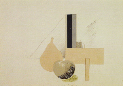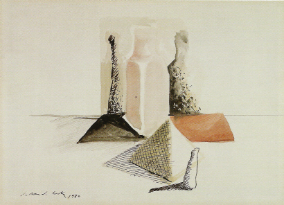 Natura morta de Morandi amb piràmide i megàlit. 1980Aquarel·la, tinta i llapis de color. 25 x 35 cm.