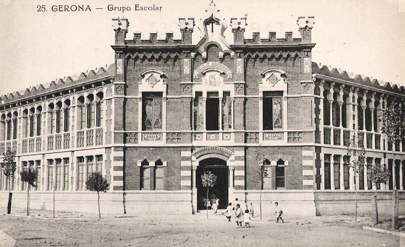 La primera pedra de l'escola va ser posada el 4 de novembre de 1908, i tres anys després, l'1 de setembre de 1911 començaren les classes al Grup Escolar, obra de l'arquitecte municipal Martí Sureda i Vila. Durant l'etapa republicana es va atorgar el nom de Joan Bruguera al Grup Escolar. Aquest va ser un metge del segle XV que fundà un col·legi per gironins estudiants de medicina a Montpeller, fomentant, d'aquesta manera, les influències de la medicina francesa a Catalunya.