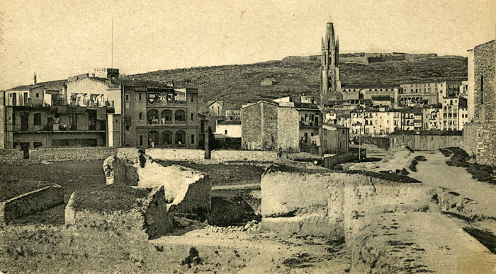 (Ampliar) - Vista parcial del baluard de la Santa Creu en ruïnes poc abans de la seva demolició definitiva. Al fons, la muntanya de Montjuíc amb el castell homònim i la torre de Sant Joan. 1905. Autor desconegut. CRDI - Ajuntament de Girona.