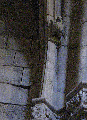Figura de l'astor del Cap d'Estopes, esculpit en una arquivolta exterior de la porta de Sant Miquel, a la Catedral de Girona.