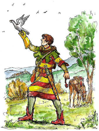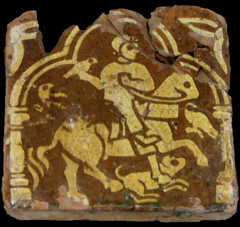 Escena de cacera amb falcó en una rajola medieval procedent de Senlis. Museu de Laon, França. Wikipèdia.