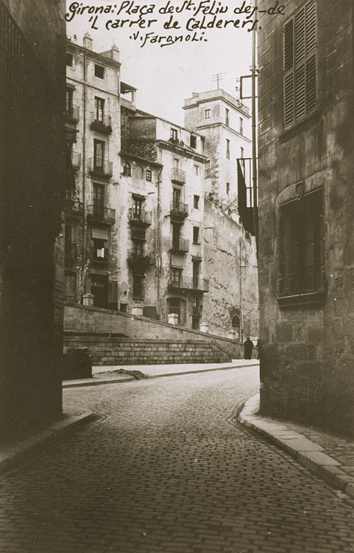 (Ampliar) - La pujada de Sant Feliu vista des carrer Calderers. Al fons, la torre de l'Institut Vell. 1925. Valentí Fargnoli i Annetta. CRDI - Ajuntament de Girona.
