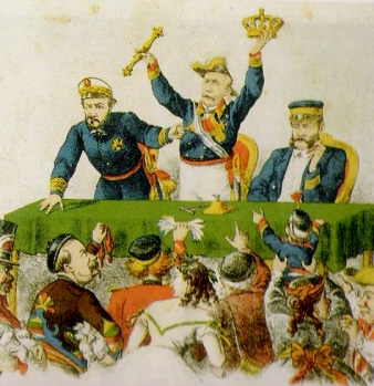 Els generals Prim, Serrano i Topete subasten els atributs del tron espanyol, publicat a La Flaca, abril de 1869. (Wikipèdia)