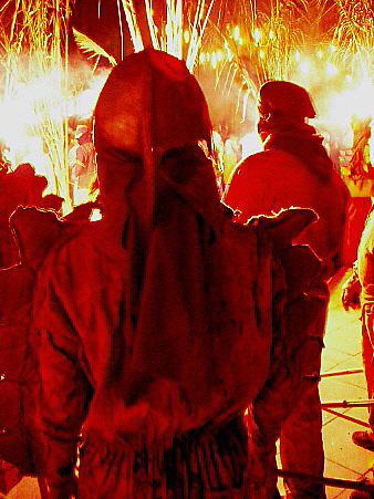 El correfoc es pot definir com una cercavila amb foc en el que una colla de diables ballen al ritme de la música tot seguint un recorregut establert, al final del qual, sovint, es representa un espectacle amb carros i bestioles. La colla dels Diables de l'Onyar, amb la participació d'altres colles de diables, van celebrar el 25 d'octubre de 2008 el correfoc més llarg dels darrers anys de Fires, amb motiu dels vint anys d'història de l'entitat. Van arribar amb una barcassa pel riu Onyar, passant per sota del pont de les Peixateries Velles i el pont de Pedra mentre alguns dels residents de les cases de colors, que havien apagat els llums de casa seva, simulaven l'incendi dels seus habitatges encenent bengales vermelles. ![]() El recorrregut, al llarg del qual es trobaven altres grups de diables que s'anaven incorporan al seguici, iniciat a la pujada del Pont de Pedra, seguia per la Plaça del Vi, Carrer d’Abeuradors, Carrer de les Ferreries Velles, Carrer de Cort Reial, Pujada de Sant Domènech, Travessia del Portal Nou, Carrer del Portal Nou, Plaça del General Marvà, Carrer de les Beates, Plaça de les Beates, Jardí de la Infància, Plaça de Catalunya, Passeig del General Mendoza, Plaça Salvador Espriu, per finalitzar, amb un espectacle final, a la Plaça del Lleó. Imatges del Correfoc de les Fires 2008, el dia 25 d'octubre. |
