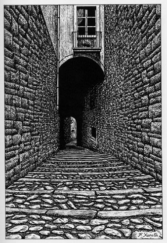 El carrer de Cúndaro. Dibuix de Fèlix Xunclà publicat a "Girona. Guia del Call" (1995).