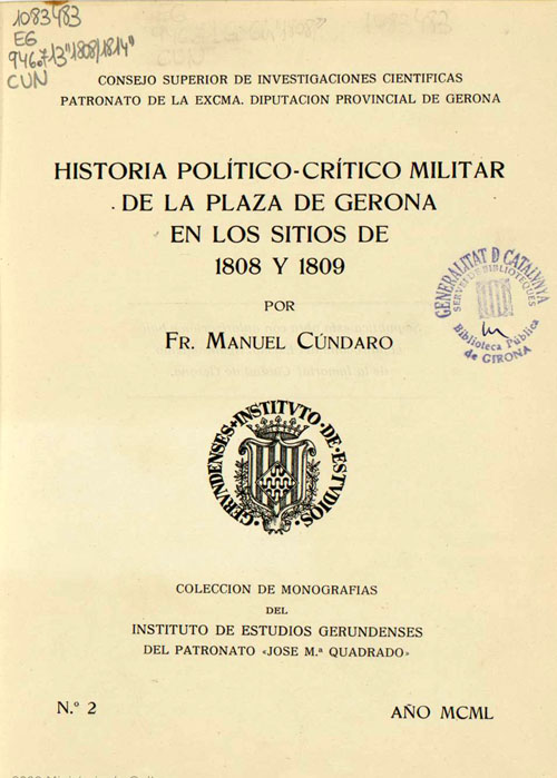 (Ampliar) - Portada de 'Historia político-crítico militar de la plaza de Gerona en los sitios de 1808 y 1809' de Manuel Cúndaro. 1953.
