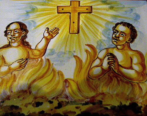 Representació d'ànimes del Purgatori, segons la simbologia tradicional. Rajola pintada. Producció de les fàbriques de València. Segona meitat del segle XIX.