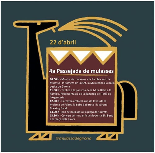 El diumenge 22 d'abril 2018, dins les activitats programades amb motiu de la Festa de Primavera 2018, va tenir lloc una trobada de mulasses a la Rambla de la Llibertat, amb la participació de la Mula Baba i la Mula petita de Girona, i la Mulassa i la Somera de Falset, amb acompanyament del Grup de Joves de la Mulassa de Falset, la Baba Babarota i la Girona Marxing Band.