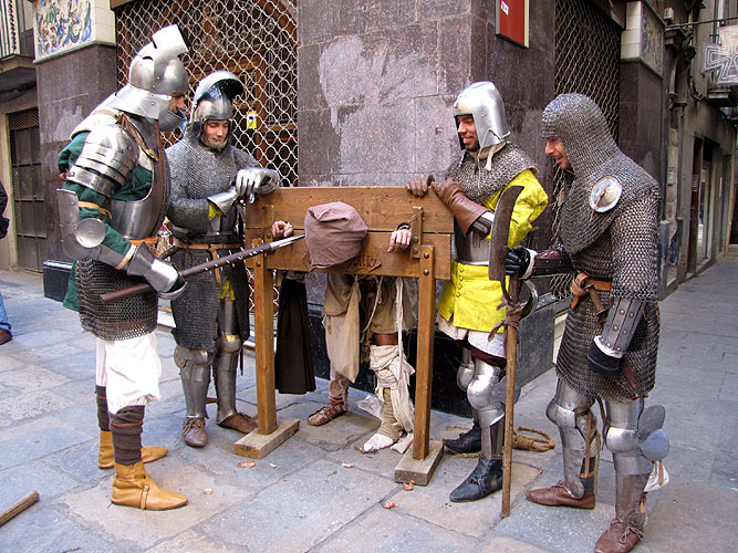 (Ampliar) - Ambientació del grup Casus Bellic a les escales de la Catedral.Com activitat complementària, el diumenge 1 de desembre 2013 va tenir lloc la visita guiada "El mercat a l'època medieval", a càrrec de Jordi Sagrera, comissari de l'exposició, amb la col·laboració del grup Casus Bellic, que va ambientar les explicacions amb la recreració de diverses escenes i personatges medievals, fins finalitzar la ruta a la plaça de les Castanyes amb la reconstrucció d'un mercat medieval.