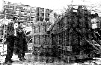 L'artista en la fase inicial de col·locació de la peça escultòrica a la plaça.