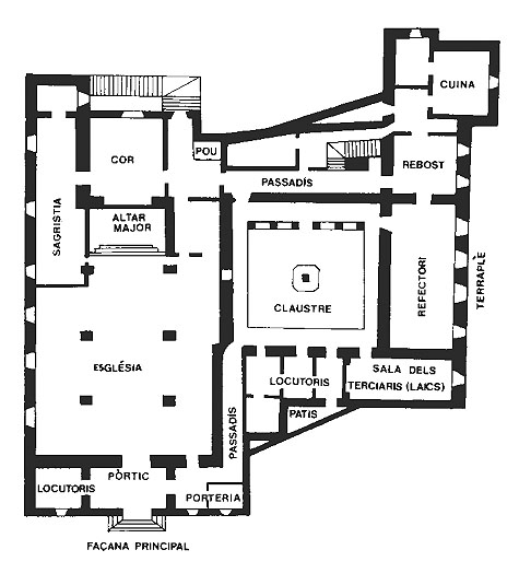 La resta de les dependències de la planta baixa (locutoris, refetor, cuina, etc.) estaven disposades al voltant del diminut claustre, com és usual en tots els convents caputxins. Igualment que l’església, aquest claustre, de petites arcades de mig punt, es va transformar a mitjan segle XIX amb la construcció de la galeria coberta corresponent al primer pis, així