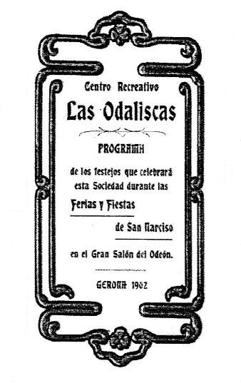 Anunci de ball de la societat "Las Odaliscas" a la Sala Odeon durant les Fires de Sant Narcís de 1902.