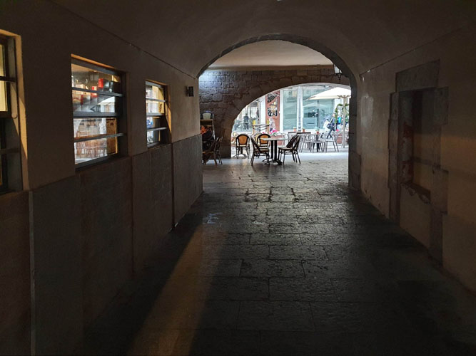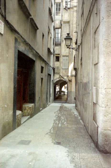 El carrer de les Olles a l'encreuament amb Mercaders. Al fons, el carrer de les Ferreries Velles i la volta d'accés a la Rambla de la Llibertat. L'edifici de la dreta va ser enderrocat per obrir-hi una plaça. 1986. Juli Torres Monsó. CRDI - Ajuntament de Girona - (Ampliar)