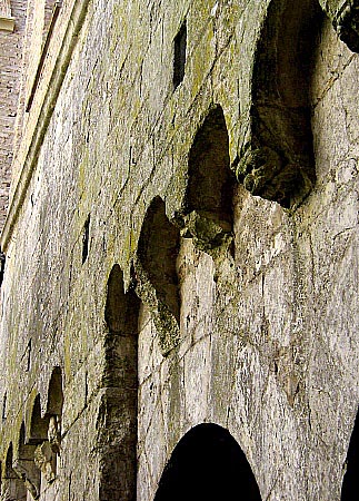 Efectivament, la majoria de les mènsules presenten un estat gairebé irreconeixible. A les fotografies es mostra el que presenta millor estat de conservació. A les galeries est i oest els arcs són d'una sola peça, i a les galeries nord i sud estan aparellats o dovellats.