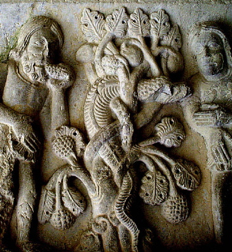 La serp enroscada a l'Arbre del Bé i del Mal, en una escena d'un capitell del Claustre de la Catedral.
