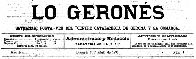 (Ampliar) - Capçalera del primer número del periòdic 'Lo Geronès', portaveu del 'Centre catalanista de Gerona y sa comarca', editat al carrer de la Sabateria Vella. Entitats i veïns de la plaçat.