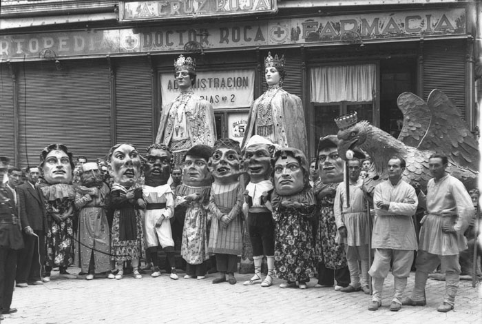 (Ampliar) - Gegants, capgrossos i l'Àliga de Corpus, juntament amb els ministrils, davant la farmàcia Roca, a la plaça de l'Oli. 1940. Foto Lux. CRDI - Ajuntament de Girona.