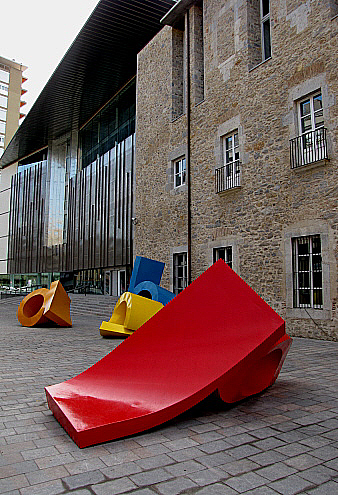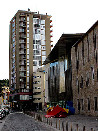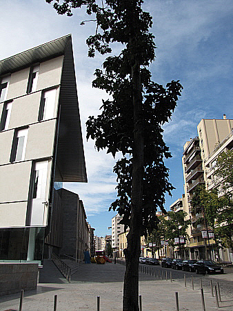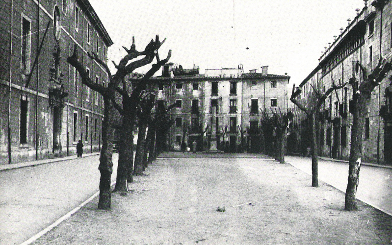 Fotografia de l'antic Carrer de l'Hospital, orientat cap a l'actual Plaça de Catalunya, amb l'Hospici (actual Casa de Cultura) a l'esquerra, i l'Hospital de Santa Caterina a la dreta. Al fons, illa de cases actualment desapareguda, que va donar lloc a la Plaça d'En Pompeu Fabra. (Ampliar imatge)