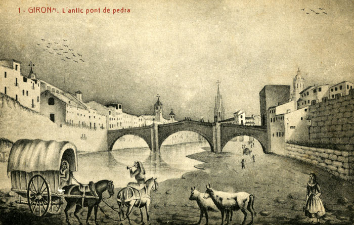 Antecedents. El pont de Sant Francesc. Les vies de comunicació de què disposava Girona entre les dues bandes de la ciutat abans de la construcció del pont de Pedra eren limitades. Una era el pont gòtic de Sant Francesc pel que, si bé hi podien transitar carruatges, ho feien amb dificultat atesa l'estretor i la irregularitat del paviment. Hi havia també les "palanques vermelles", un pont de fusta situat on avui hi ha el de les Peixateries Velles, i un altre, anomenat "de la Princesa" que unia l'extrem del carrer Argenteria i la plaça de la Independència. També hi havia algunes passarel·les i palanques: una al carrer de la Barca, i una altra al portal d'en Vila, per la que havia desfilat alguna processó el segle XVII, quan les processons passaven per alguns carrers del Mercadal. Més tard, i encara a la primera meitat del segle XIX, ho feien pel pont de Sant Francesc.