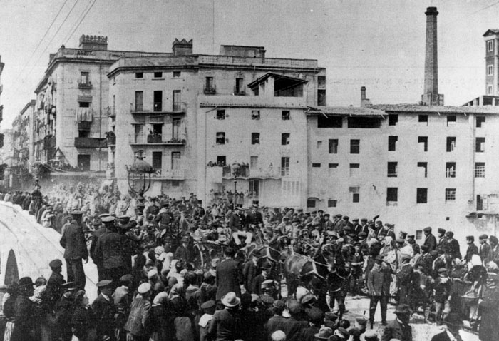 (Ampliar) - Primera visita oficial del rei Alfons XIII. Comitiva al seu pas pel pont de Pedra. 1904. Autor desconegut. CRDI - Ajuntament de Girona.
