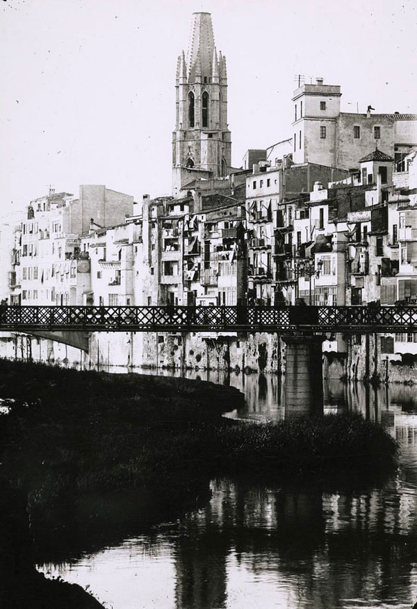 (Ampliar) - Vista del riu Onyar amb el pont de Sant Agustí. Al fons sobresurten el campanar de l'església de Sant Feliu i la torre de l'Institut Vell. 1919-1930. Valentií Fargnoli Iannetta. CRDI - Ajuntament de Girona.