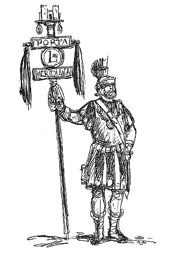 Esboç d'un signifer portant el signe d'honor de la Porta Meridiana. Dibuix de Joaquim Pla i Dalmau