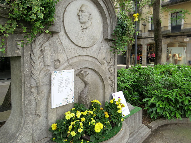Muntatge floral 'Ciutat de fonts'. Font de Mossèn Cinto, a la Rambla Verdaguer. Girona és una ciutat de fonts. Algunes d'elles oblidades pel pòsit del temps, difuminades entre l'arquitectura dels carrers o pels corriols de les rodalies; moltes, fins i tot, difícils de situar al mapa pels gironins del nou mil·lenni. Fonts d'aigua clara que, d'altra banda, havien estat l'objecte i el punt de trobada dels diumenges a la tarda de molts ciutadans de la ciutat dels quatre rius, que sabien que n'hi ha prou amb un doll d'aigua i quatre rialles per passar una bona estona. Disseny i creació de Mireia Esteve, Francesc Adroher, Coralí Àlvarez, Pere Garriga, Isabel Pérez, Quim Solà i Marta Vidal.