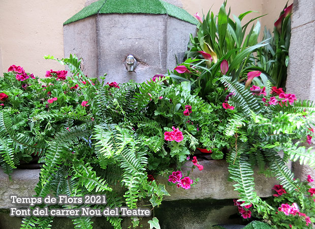Muntatge floral 'Ciutat de fonts'. Font del carrer Nou del Teatre. Girona és una ciutat de fonts. Algunes d'elles oblidades pel pòsit del temps, difuminades entre l'arquitectura dels carrers o pels corriols de les rodalies; moltes, fins i tot, difícils de situar al mapa pels gironinsdel nou mil·lenni. Fonts d'aigua clara que, d'altra banda, havien estat l'objecte i el punt de trobada dels diumenges a la tarda de molts ciutadans de la ciutat dels quatre rius, que sabien que n'hi ha prou amb un doll d'aigua i quatre rialles per passar una bona estona. Disseny i creació de Mireia Esteve, Francesc Adroher, Coralí Àlvarez, Pere Garriga Isabel Pérez de Puig, Quim Solà, Marta Vidal.