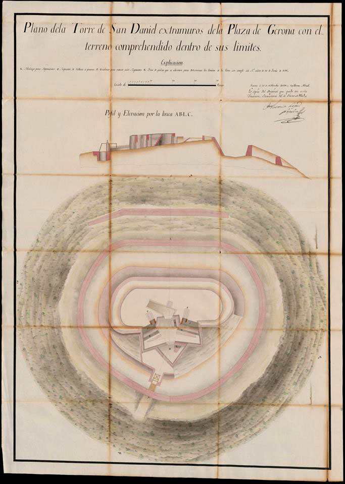 (Ampliar) - Plano de la Torre de San Daniel extramuros dela Plaza de Gerona con el terreno comprehendido dentro de sus límites. 1801. Archivo General Militar de Segovia.
